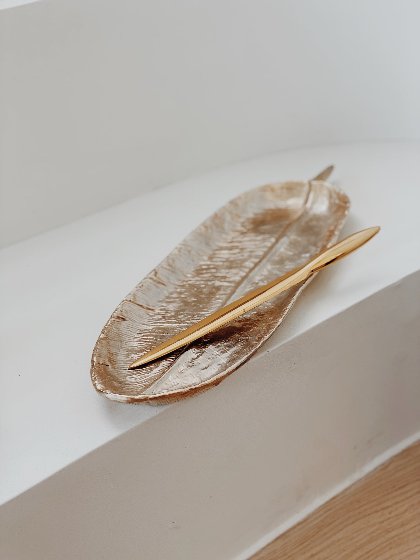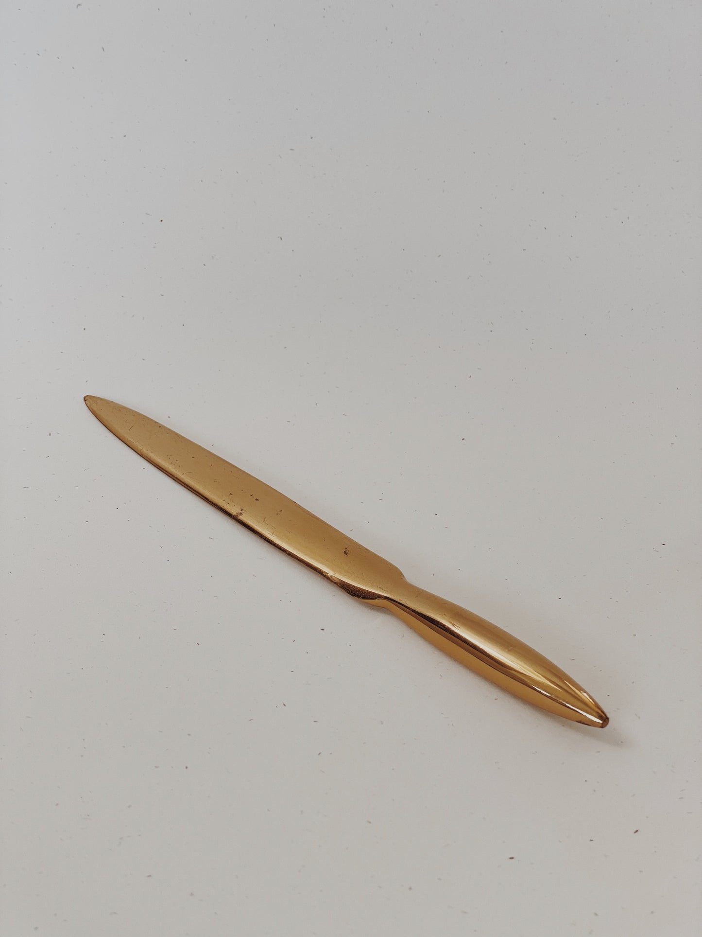 A cast brass letter opener from Sir / Madam. A few slight spots due to use, but generally in good condition. It has some weight, and has a very minimal and slender design.
