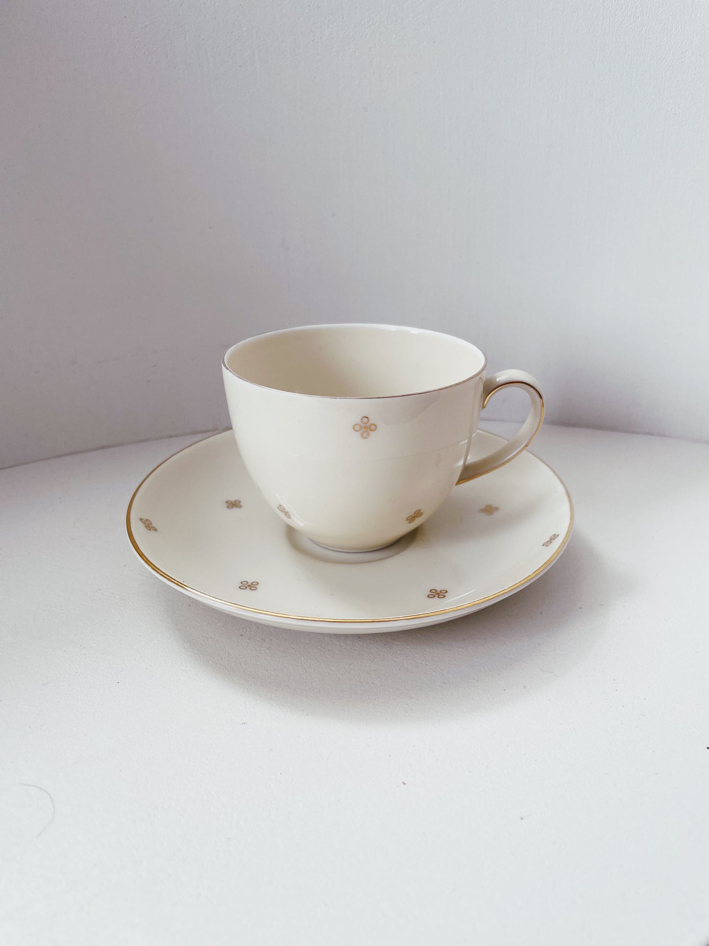 a single cream teacup with minimal gold pattern. underside reads 'porzellanfabrik arzberg, bayern', likely a trademark of a german manufacturer Arzberg of porcelain founded in 1887 in Arzberg, Bavaria.