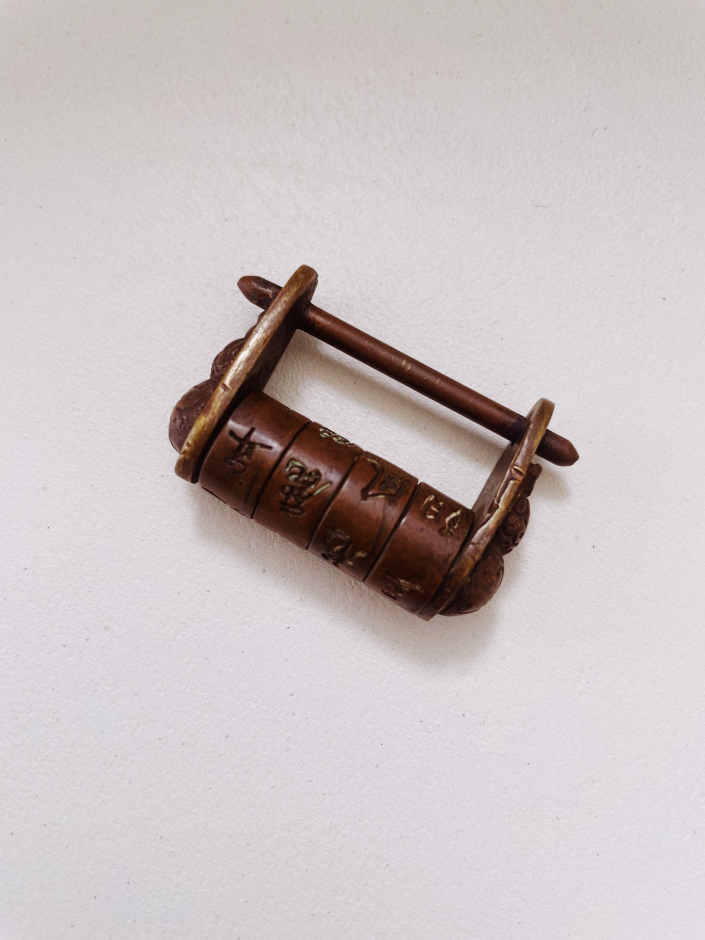 a curious trinket picked up in the midst of vintage sourcing. a brass lock with a rotating cylinder of chinese characters inscribed. after extensive searching online this seems to be a modern replica of old chinese suitcase locks, and now known to be some sort of game to unlock. try your luck if you will!